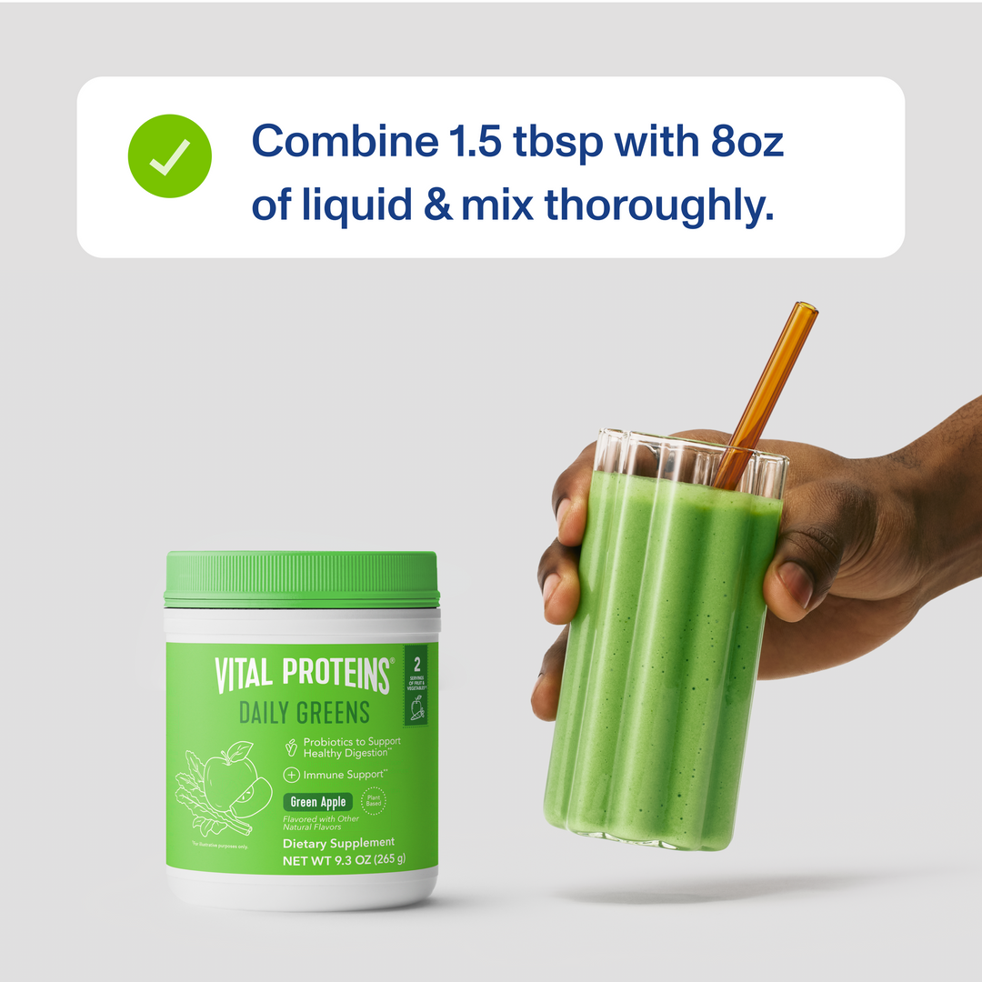 Our Daily Greens powder contains two full servings of fruits and vegetables. Daily Greens comes packed with spirulina, spinach, kale, broccoli, carrot, apple, blueberry, cranberry, green tea, turmeric, tart cherry, and our Vital Proteins ® Digestive Support Blend.