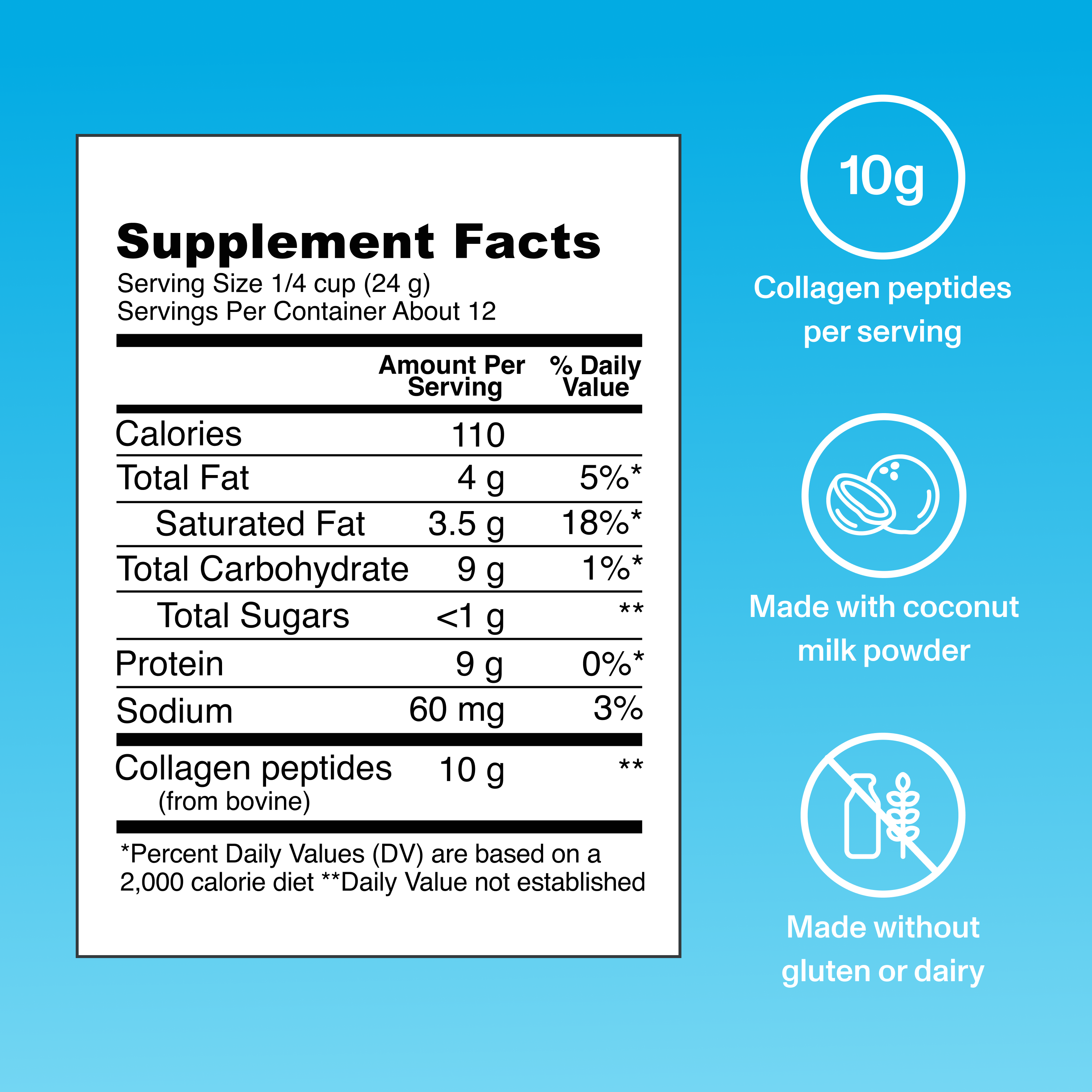 For a made-without-dairy upgrade to your morning routine, reach for Vital Proteins Collagen Creamer® in Coconut! Packed with 10g of collagen per serving and MCTs from coconut milk powder, this morning staple ensures a peppy start to any day.